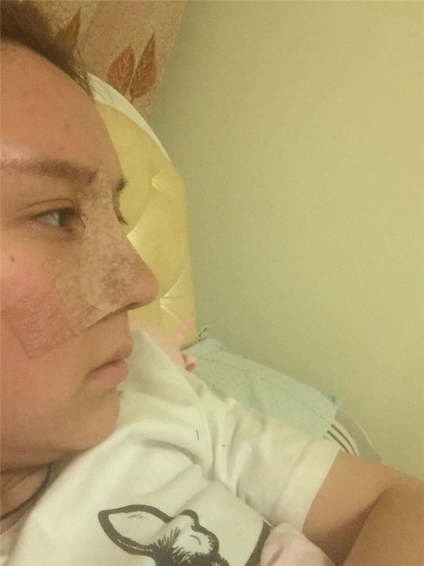 这是第二天的早晨拍的 因为医生嘱咐 需要输液 在这期间我的鼻子并没有出现淤青 散青的过程 所以很多人做完之后惨不忍睹的样子 可能和医生技术包括无菌环境还有个人体质有很大的关系吧
